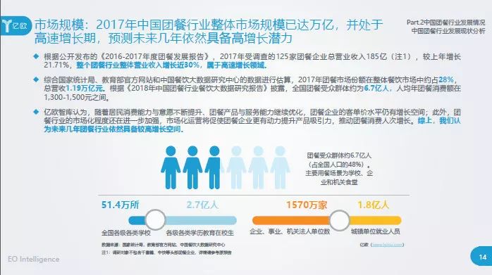 《2018年中國團餐行業(yè)研究報告》顯示,團餐作為餐飲界最大的“黑馬”,2017年整個團餐行業(yè)收入增長近30%,已占整個餐飲業(yè)的28%,約1.19萬億市場規(guī)模。